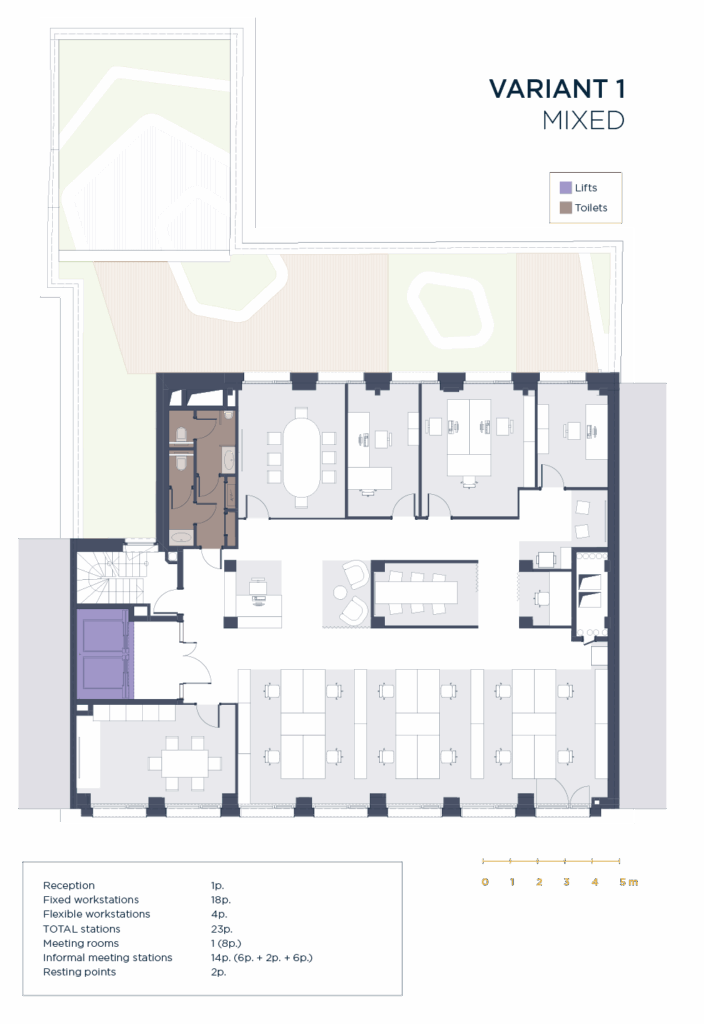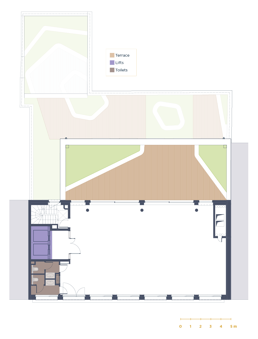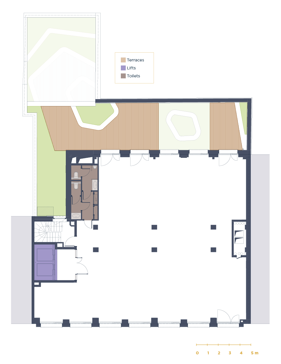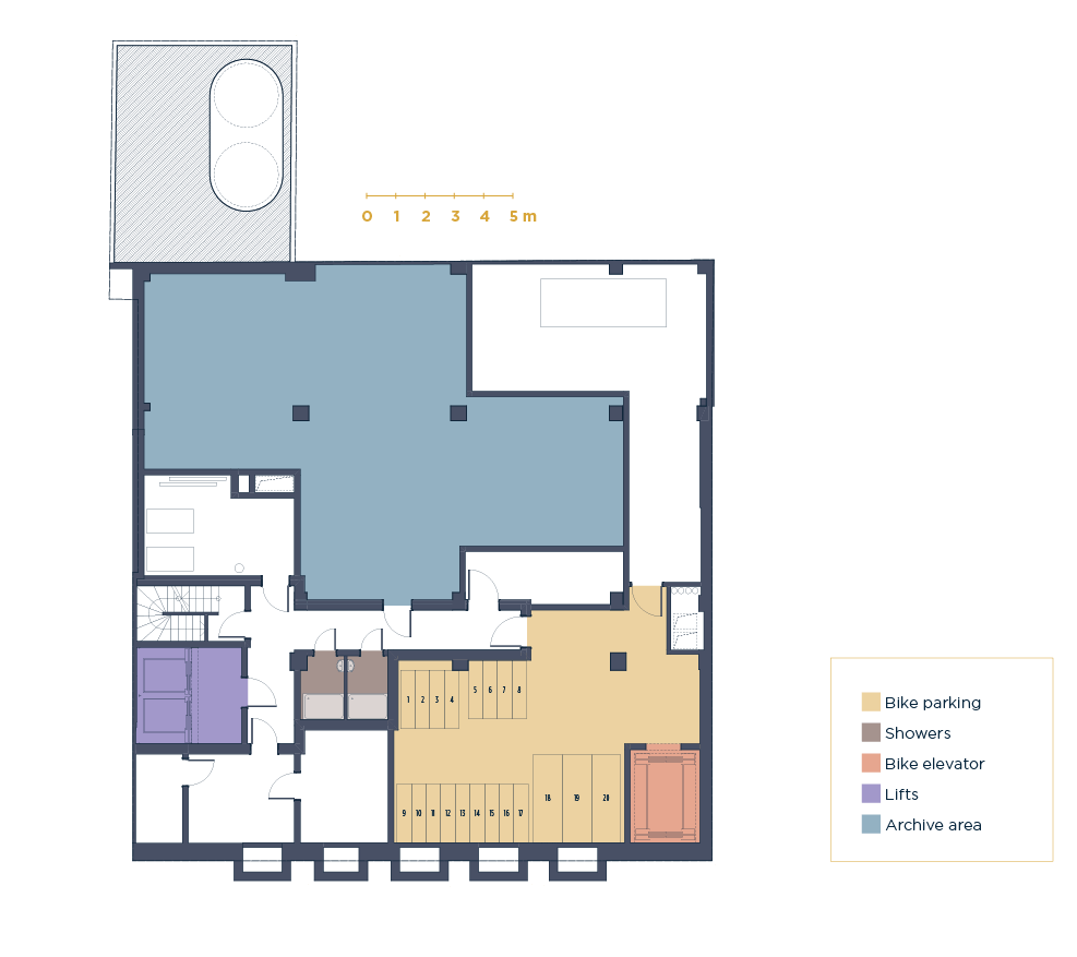 Raised floors with ample technical voids (up to 100 cm locally)