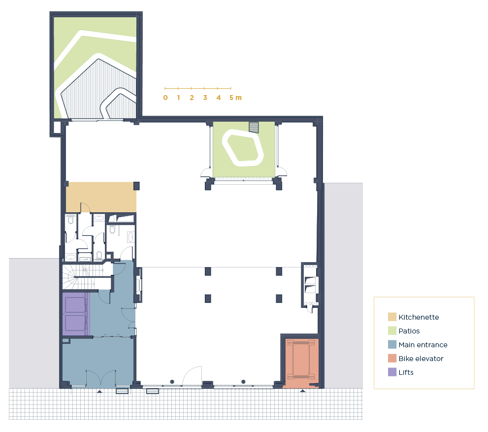 Large glazed openings at street level that enhance natural light and visual transparency